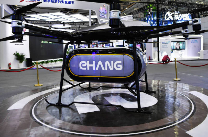 ↑在第四届数字中国建设峰会的数字中国建设成果展览会上,载人自动驾驶飞行器也从科幻片里“飞”到了现场(4月25日摄)。