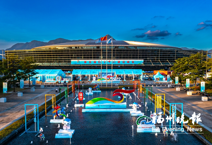 会展中心前广场“有福之州”城市形象标识、“数娃”等造型布景让人眼前一亮。