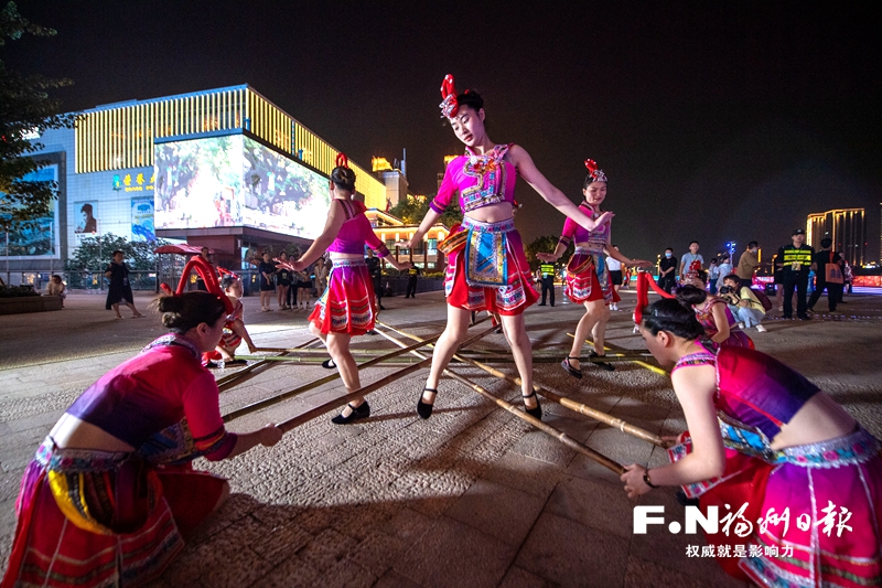 铃鼓叮当,舞蹈《好儿好女好家园》喜气洋洋活力四射;水袖翻飞,闽剧《荔枝换绛桃》情意绵绵动人心弦;乡音入耳,福州话歌曲《齐齐走》与《一粒橄榄》带来满满“虾油味”……距离热闹的滨江步行街几百米远的闽江之心青年广场上,充满闽都文化特色的节目一一上演,熟悉的家乡味引得群众纷纷驻足拍照、热情喝彩。