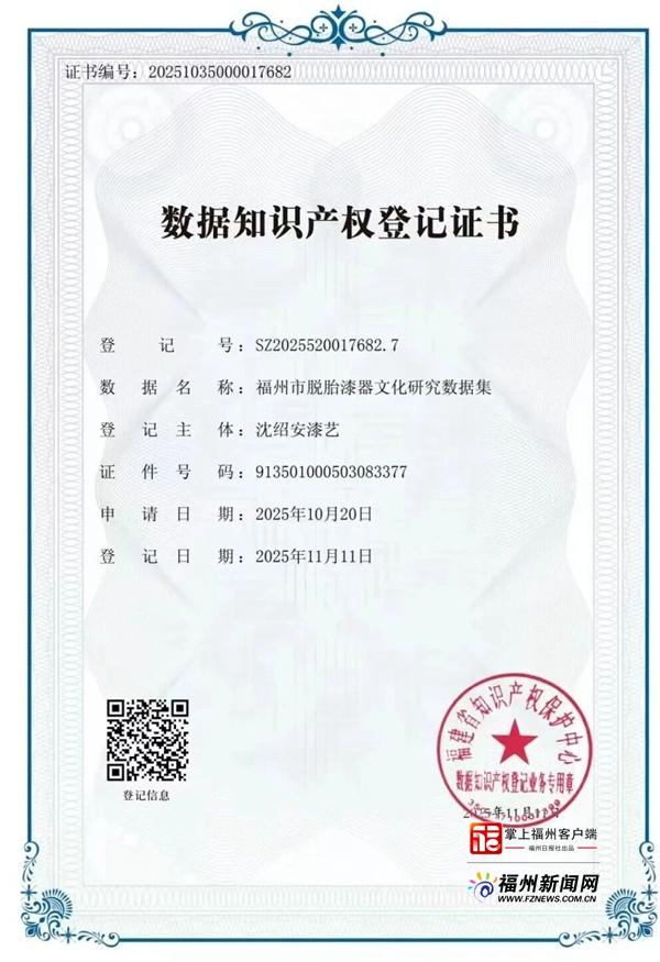 11日,福建省沈绍安漆艺博物馆正式获颁全市首张地理标志产品数据知识产权登记证书,标志着福州在“地理标志+数据知识产权”融合探索中迈出了关键一步,也为福州脱胎漆器等传统工艺的现代化转型打开了新空间。