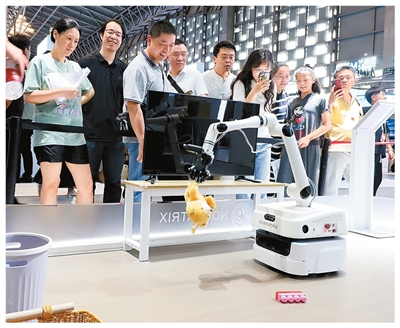 2024世界人工智能大会上,一款具备物体识别和归类摆放功能的智能家居机器人在进行作业演示。新华社记者 方喆摄