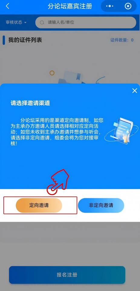2.进入小程序后点击“分论坛嘉宾”,手机号登录后,点击“报名注册”。