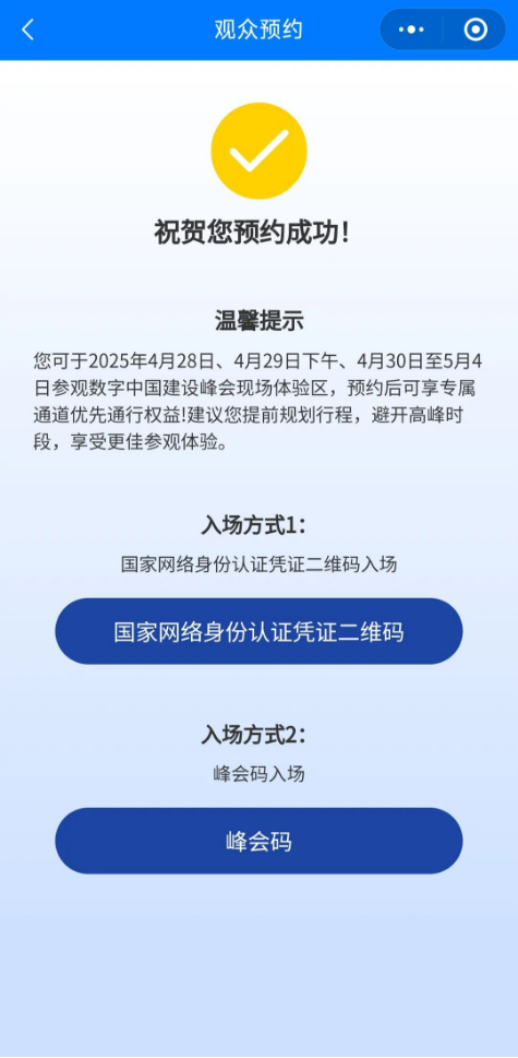 进入“数字中国建设峰会”官方小程序,点击“参观预约”,根据提示填写信息完成操作,就能预约成功了。