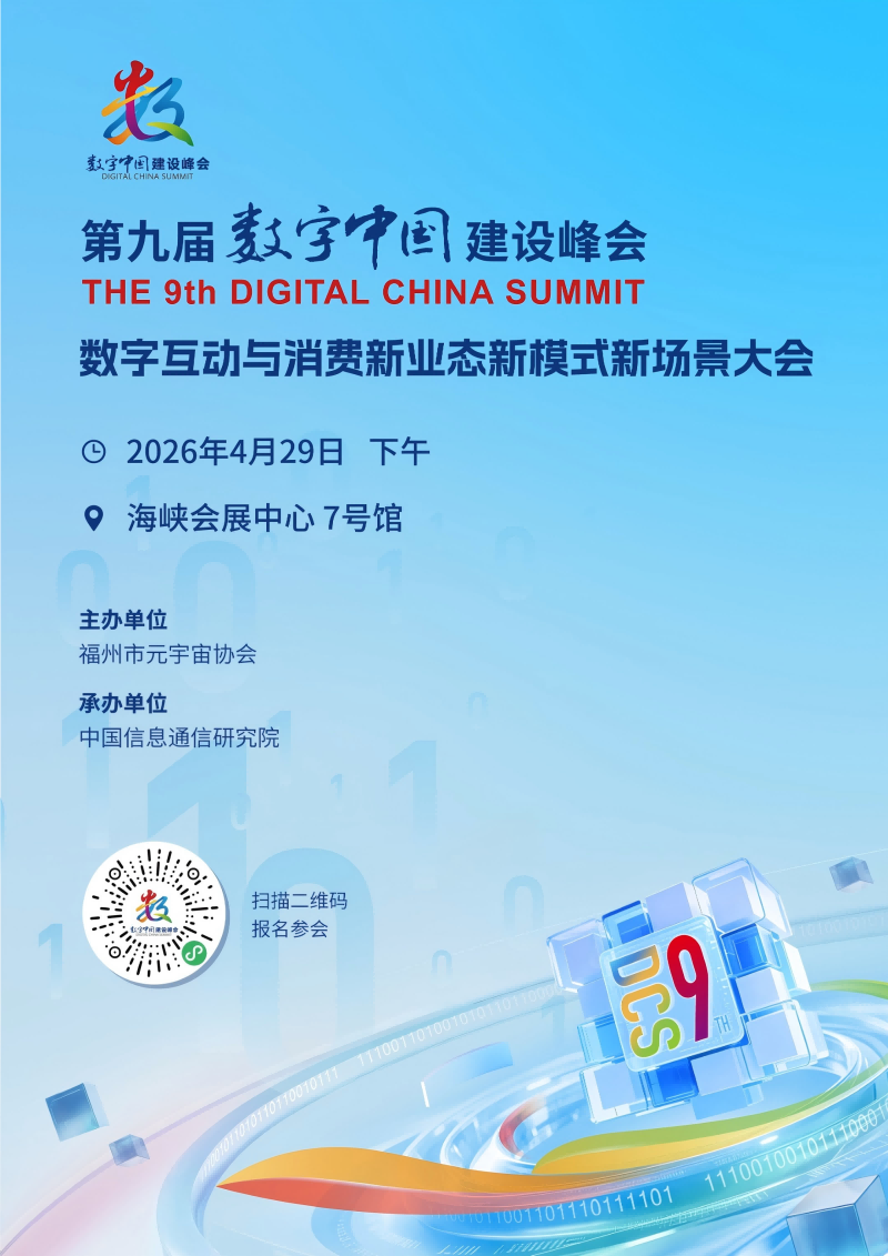 第九届数字中国建设峰会主题交流——数字互动与消费新业态新模式新场景大会,将于4月29日下午在福州海峡国际会展中心7号馆举办。
